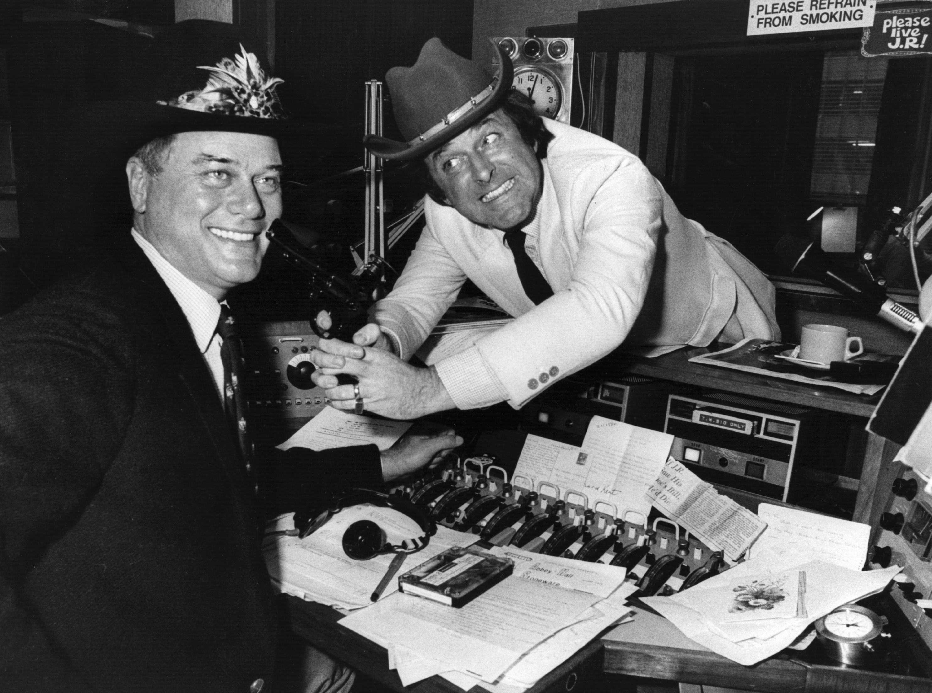 Terry Wogan e Larry Hagman | © Tony Weaver/Getty ImagesIrish television chat show celebrity and radio broadcaster Terry Wogan with American soap star Larry Hagman, who plays JR in 'Dallas'. At the time, 'Who Shot JR?' was the burning question on the lips of a nation of soap addicts, and Wogan is eagerly exploiting the photo-opportunity on his radio show. Original Publication: People Disc - HP0168 (Photo by Tony Weaver/Getty Images)