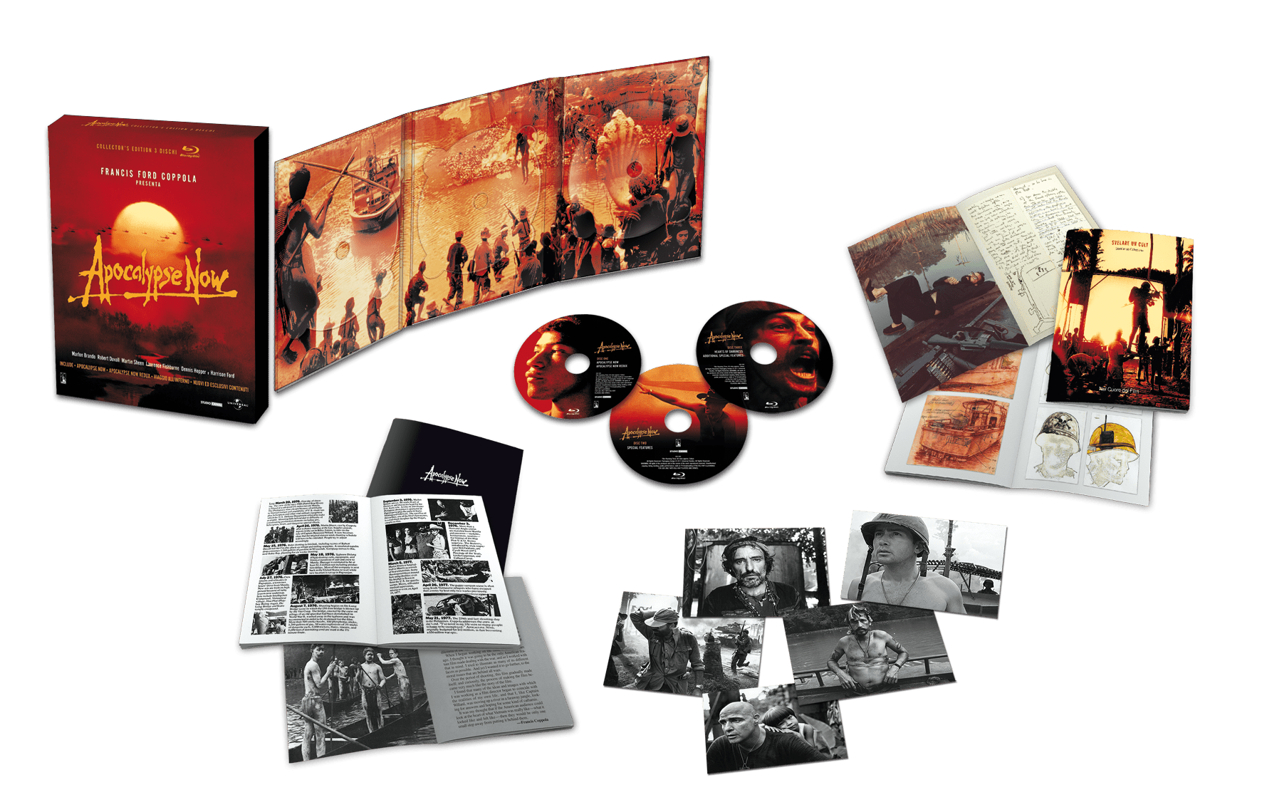 COLLECTOR’S EDITION 3 DISCHI – CONTENUTI SPECIALI: TUTTI I CONTENUTI DELL’EDIZIONE PRECEDENTE ED IN PIU’ • Documentario “Viaggio all’inferno”: l’Apocalisse di un Regista: la versione integrale del documentario diretto da Eleanor Coppola, relativo alla realizzazione del film; • Sceneggiatura completa di John Milius con le annotazioni di Francis Ford Coppola; • Galleria degli storyboard con oltre duecento disegni; • Archivio Fotografico che comprende oltre cento foto del dietro le quinte, i press kit e le fotografie di Mary Ellen Mark. • Archivio Marketing: galleria di poster, locandine e trailer cinematografici.