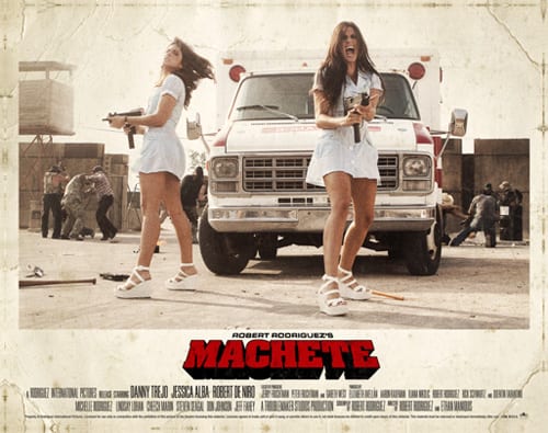 La storia racconta dell’ex agente federale messicano Machete (Danny Trejo) arruolato per assassinare il senatore corrotto McLaughin (Robert De Niro). Ma qualcosa va storto e preso in trappola Machete dovrà darsi alla fuga. Ce la farà grazie all’aiuto di tre particolarissimi personaggi: la focosa Luz (Michelle Rodriguez), il suo fratello spirituale Padre (Cheech Marin) e April (Lindsay Lohan), una giovane ragazza con l’ossessione delle pistole. Ma sulle sue tracce c’è anche la sexy agente Sartana (Jessica Alba), che è decisa a catturarlo a qualunque costo.