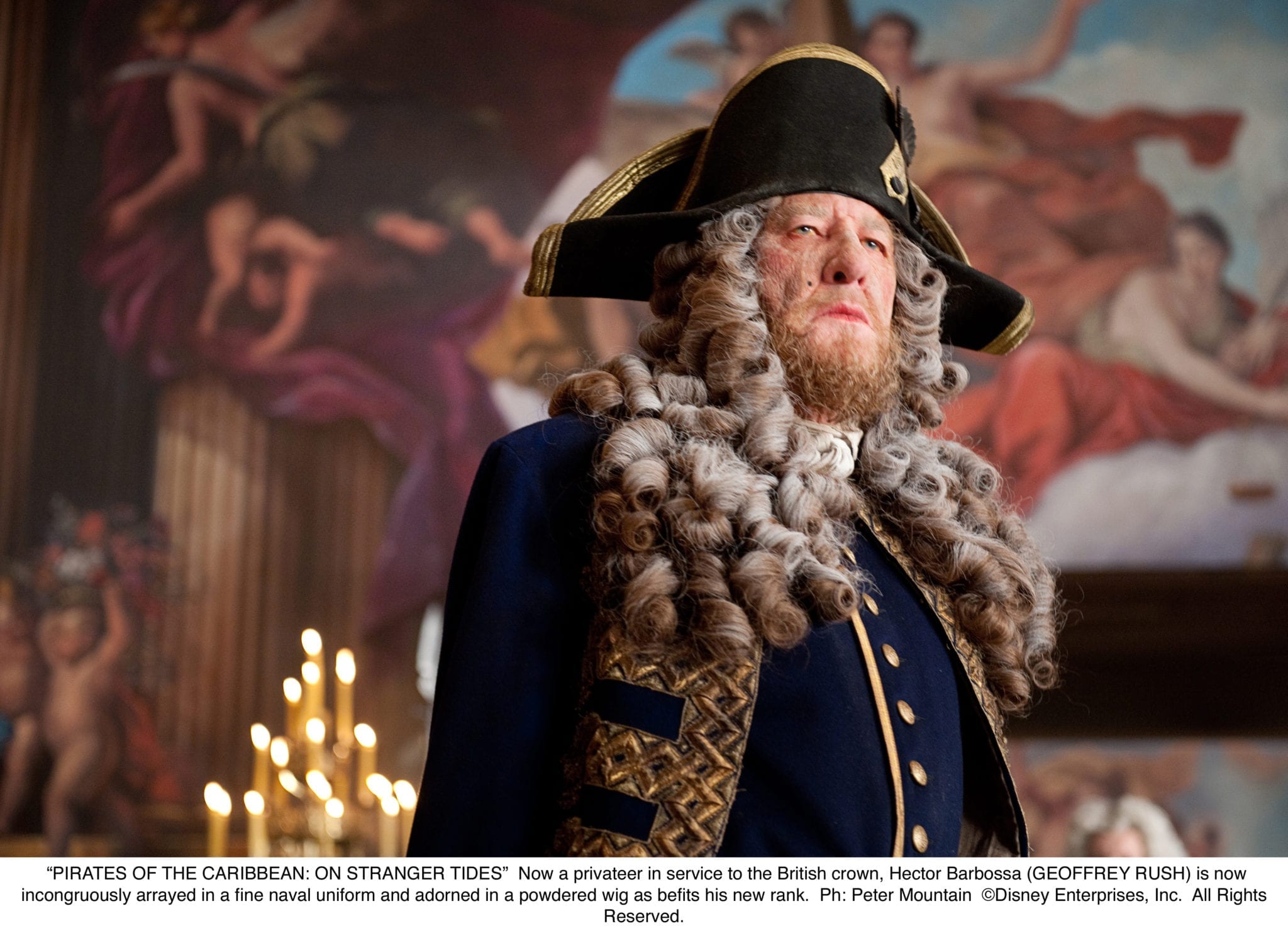 Now a privateer in service to the British crown, Hector Barbossa (GEOFFREY RUSH) is now incongruously arrayed in a fine naval uniform and adorned in a powdered wig as befits his new rank.