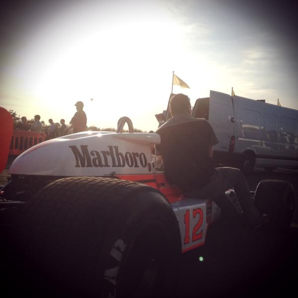 Ecco allora che prima abbiamo potuto visionare i protagonisti e la straordinaria somiglianza tra loro e i piloti veri , poi immagini di particolari fermi come una bottiglia dello spumante della vittoria in un cestello pieno di ghiaccio sopra un tavolino con il trofeo della corsa o il casco di Hunt in primo piano. Ed ora i box ed il profilo di una MacLaren di quegli anni ferma dopo l’arrivo.