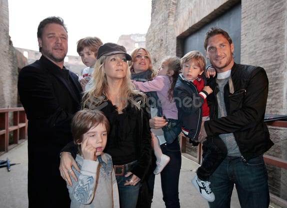Ecco alcune immagini dal Colosseo, con Russell Crowe in compagnia di Francesco Totti.
