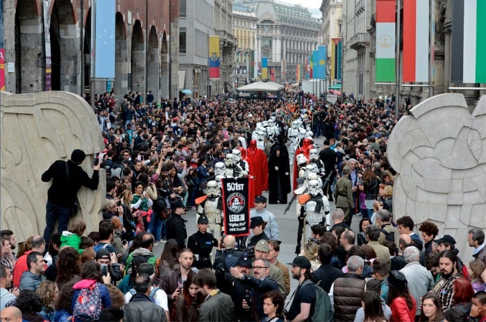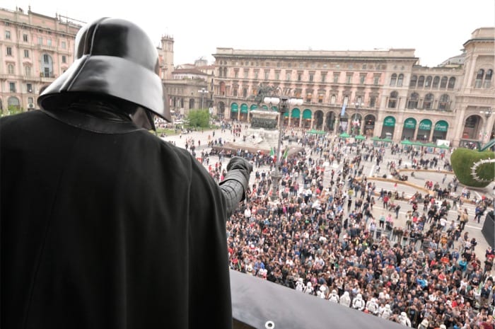 May the 4th be with you: oggi tutti i fan di George Lucas festeggiano lo Star Wars Day, ma qualcuno lo ha fatto in anticipo ieri a Milano. Erano tantissimi i fan che hanno seguito l’evento, tenutosi un giorno prima per far sì che più persone potessero parteciparvi. Una parata che si è conclusa in piazza Duomo con Darth Vader affacciato da una terrazza per dare il via alla conquista di Milano da parte dell’Impero.